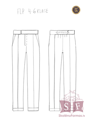 Klasiskas taisnstaru bikses ar divām kabatām un jostas platuma regulēšanas iespēju ar pogājamiem gumijas savilcējiem un auduma rezervi sēdvīlē. Bikšu gali ar rezervi, neatšūti.