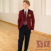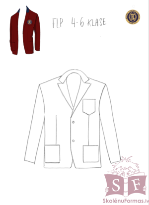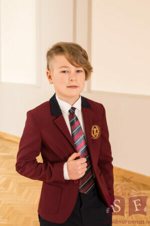 Klasiska oderēta bordo žakete ar zilu apkakli, ar izšūtu emblēmu uz krūšu kabatas un divām uzliktām sānu kabatām, diviem šķēlumiem, ar piedurkņu pogām un rezervi piedurkņu pagarināšanai