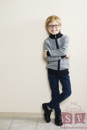 Krāsa: gaiši pelēka ar melnām apdarēm, apkakli un rāvējslēdzi.