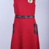 Adījums kombinējumā ar rūtainu audumu: sarafāna svārku daļa ielocēs un josta no rūtaina auduma.