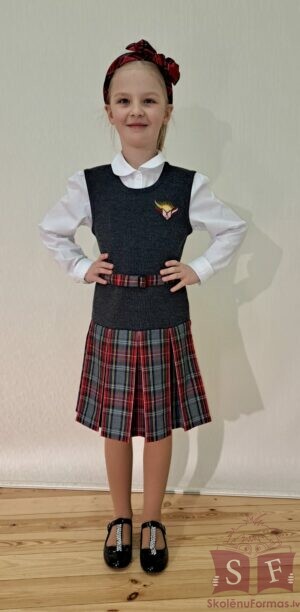 Krāsa: Tumši pelēka adījuma augšdaļa ar rūtaina auduma ieloču svārku daļu.
