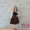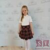 Pussaulē piegriezti rūtaina auduma svārki ar kabatu sānu vīlē. Vidukļa apkārtmērs regulējams ar piepogājamu gumiju jostas iekšpusē. Sānā rāvējslēdzis. Izstrādājuma sastāvs: 35% – viskoze 65% – poliesteris